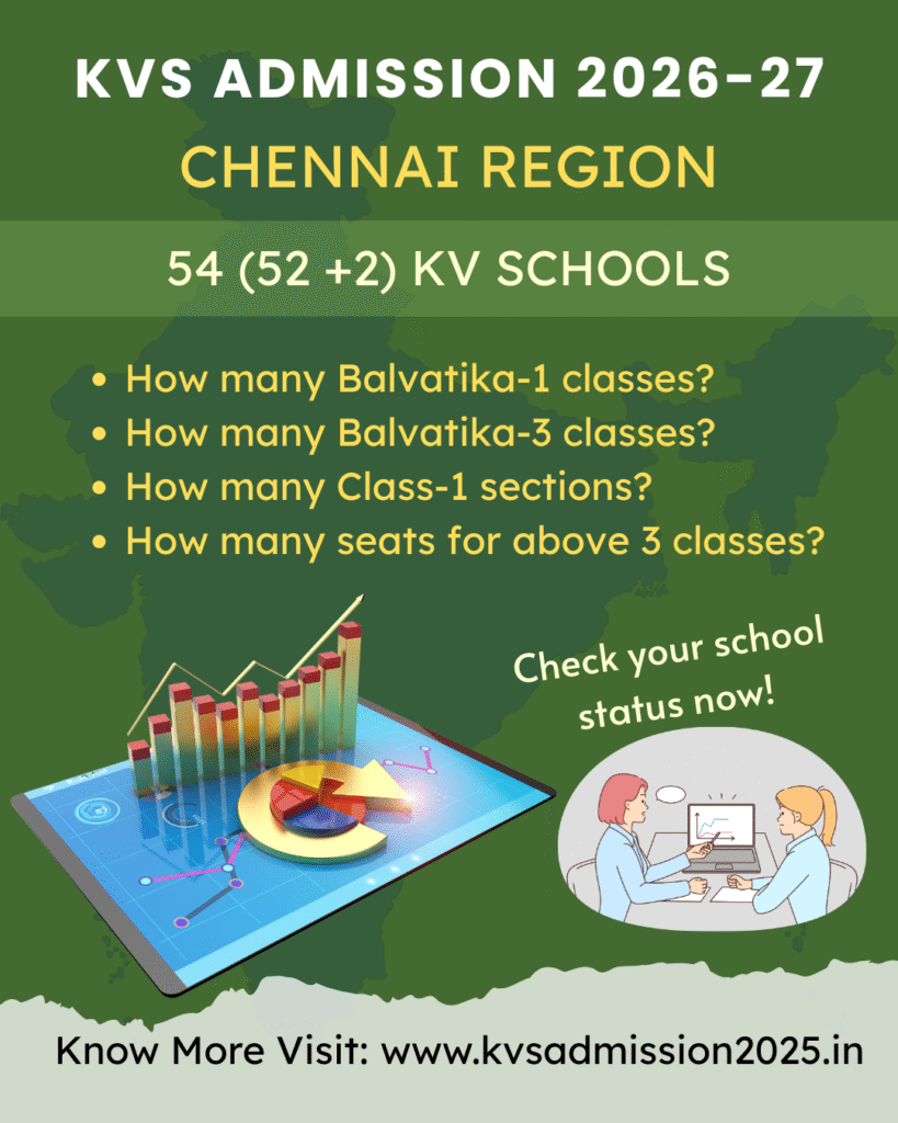 KV Tamil Nadu Chennai Admission 2026-27 Seat Availability Checker: If you are looking to enroll your child in Kendriya Vidyalaya schools within the Tamil Nadu (Chennai region), you have come to the correct location to find all pertinent information regarding KV schools in the state of TN. Kindly verify the details of your nearest KV school regarding the availability of seats for Class-1, Balvatika-1, and Balvatika-3. The information is provided section-wise for all KV schools situated in the Chennai region, including reservations for the RTE category!